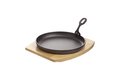 Bord met een doorsnede van 22 cm, gemaakt van gietijzer op houten plank. Wordt geleverd met losse grijpsteel. Om bijvoorbeeld tapas of hete gerechten op te serveren. Van het merk Cosy&Trendy. Voor het eerste gebruik, grondig reinigen met warm zeepwater. Bestrijk het gietijzeren pannetje met keukenolie. Verwarm de oven op 200Ì¡ en plaats het pannetje in de oven gedurende 15 minuten. Het oppervlak van het gietijzer zal zo smaak afgeven en een antiaanbaklaag wordt gevormd. Het gietijzer zal zeer heet worden, gebruik daarom een ovenhandschoen of de losse grijpsteel welke bij deze set wordt meegeleverd. Het gietijzer behoudt de warmte en houdt het gerecht warm op tafel. Doe het houten plankje niet in de oven. Reinig door te wassen met een vochtige doek, niet vaatwasserbestendig.
