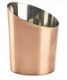 Frietbakje vervaardigd uit koper, schuin en glad model. Afmetingen: 9,5 cm doorsnede en 11,6 cm hoog. Voor een hippe presentatie van gerechten en snacks. Geschikt voor horeca gebruik. Niet vaatwasserbestendig. Leuk in combinatie met Acacia hout of leisteen.
