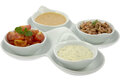 Hapjesset met 4 bakjes op een schaal van 25 x 25 cm. De bakjes hebben een doorsnede van 10,9 cm. Geschikt voor horeca gebruik. Van het merk Cosy&Trendy.