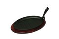 Serveerschaal vervaardigd uit gietijzer op een houten onderzetter. Afmeting 28 cm lang en 17,5 cm breed (gietijzer deel). Voor een prachtige presentatie van uw gerechten op tafel. Horeca geschikt.